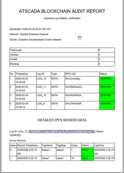 - Oracle verifies data integrity for ATSCADA Blockchain