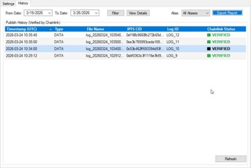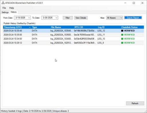 3. View data on the ATSCADA Publish Blockchain application. Switch to the History tab to view the file publishing history.