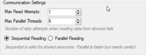 • Parallel Reading (Not Selected): Sends multiple read requests at the same time. This is ideal for Ethernet-based communication such as Modbus TCP or OPC UA, significantly increasing data acquisition speed, but it requires the target device to support multi-threaded processing in the ATSCADA installation guide.