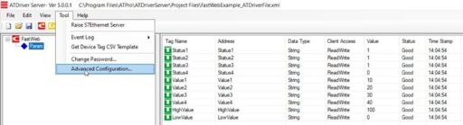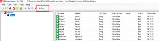 As shown above, all tags configured in ATDriver Server currently have Value = null and Status = BAD because the server reading state is set to Stop.