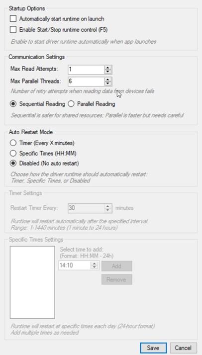 • Enable Start/Stop runtime control: Allows users to control whether ATDriver Server reads values or stops reading values on the server.