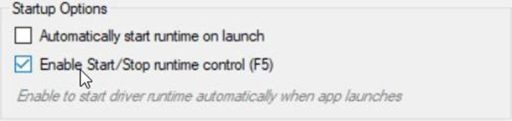 Close-up of ATDriver Server startup options showing Enable Start/Stop runtime control (F5) checked and Automatically start runtime on launch unchecked.