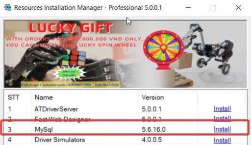 ATSCADA Resources Installation Manager highlighting MySQL component version 5.6.16.0 install option