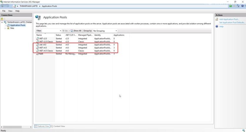Internet Information Services IIS Manager showing Application Pools with .NET versions highlighted