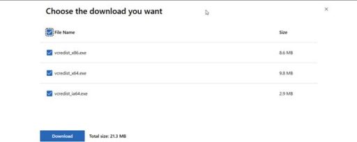 Microsoft download page showing Visual C++ Redistributable files selected for download