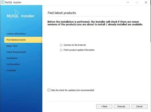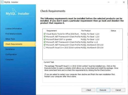 MySQL Installer check requirements screen showing prerequisite components before installation