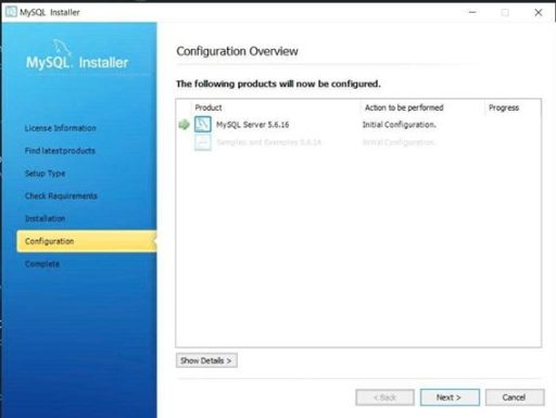 MySQL Installer configuration overview screen for MySQL Server 5.6 initial setup