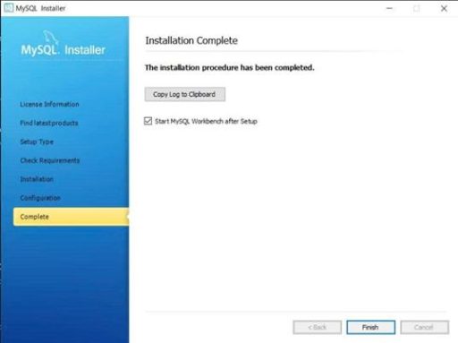 MySQL Installer installation complete screen with Finish button and Workbench option