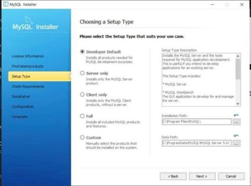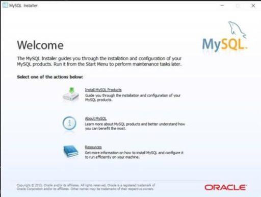 MySQL Installer welcome screen with install MySQL products option on Windows