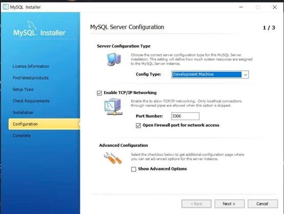 MySQL Server Configuration step 1 with Development Machine and TCP IP networking options