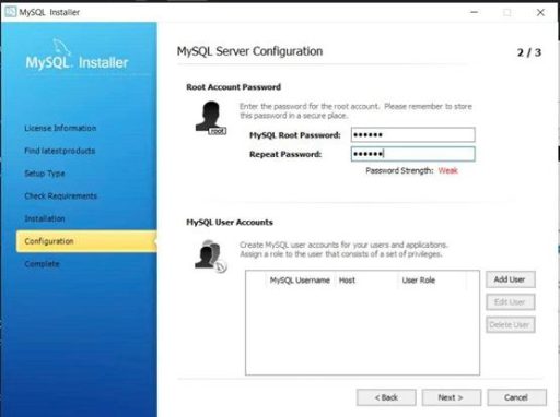 MySQL Server Configuration step 2 showing root password setup and user accounts