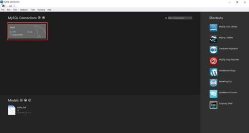 MySQL Workbench homepage showing the first root connection selected for database setup and management