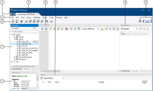 MySQL Workbench interface overview showing navigation panel, schema browser, SQL editor, query tools, and output sections with labeled components