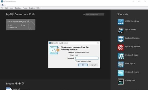 MySQL Workbench password prompt asking for the root user password to connect to the local MySQL server