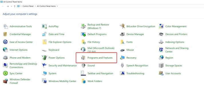 Windows Control Panel All Control Panel Items with Programs and Features highlighted