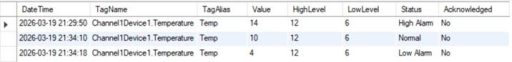 When the value exceeds the high threshold or drops below the low threshold, the data will be stored in the alarmlog table in ATSCADA iTools.