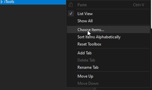 Then right-click on the newly created iTools tab and select Choose Items: