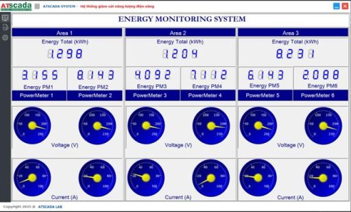 Requirements: There are 3 areas that require power management, including a factory, a residential zone, and households. Each area has 2 power meters. It is necessary to build a monitoring system that can view the parameters of all meters and display the electrical diagram of the 3 areas on the Web for easy monitoring and operation. The system must calculate electricity costs according to the 3 time-of-use tariff periods regulated by the government. ATSCADA Power Management System