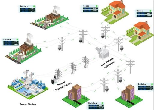 Model of the power grid diagram from the power plant to 3 areas: Industrial park – High-rise building – Residential area