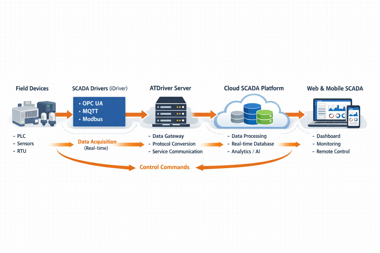 ATSCADA provides a modern cloud SCADA architecture designed for industrial environments.