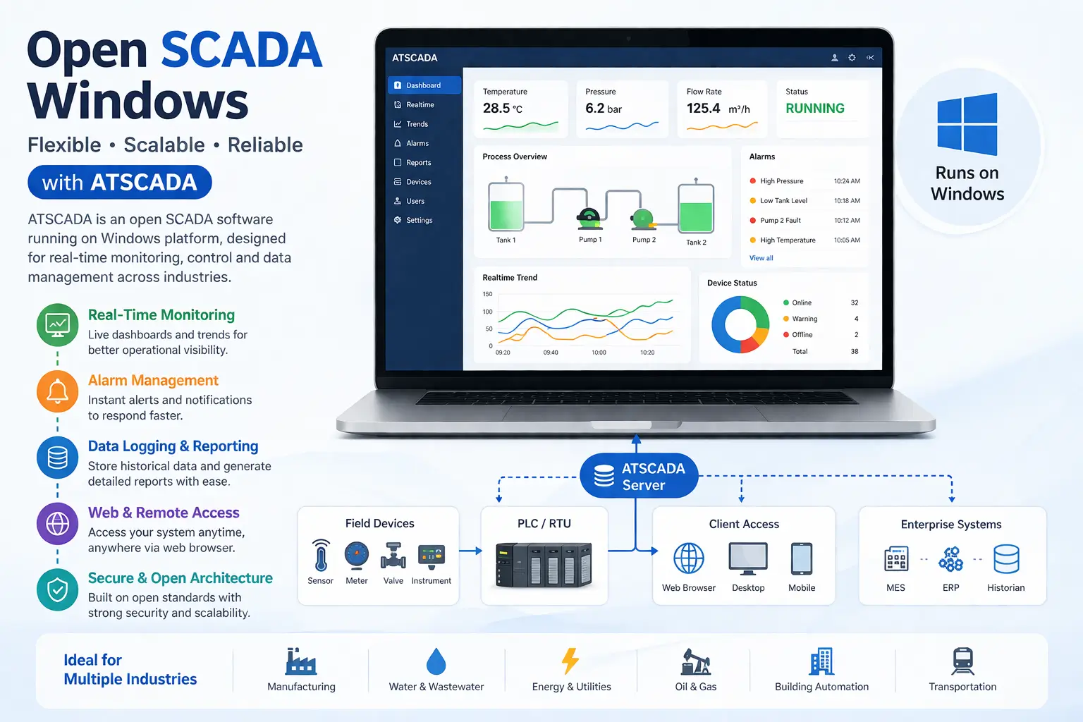 For businesses seeking a reliable and scalable solution, ATSCADA offers a robust platform that fully leverages the advantages of open SCADA Windows. From real-time monitoring to seamless integration, this approach enables smarter industrial automation across multiple sectors.