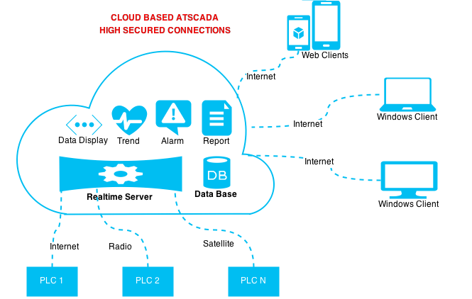 ATSCADA follows a centralized system model where all data is processed on a server and distributed to different types of clients. This structure ensures consistent data handling and reliable system control in modern SCADA software