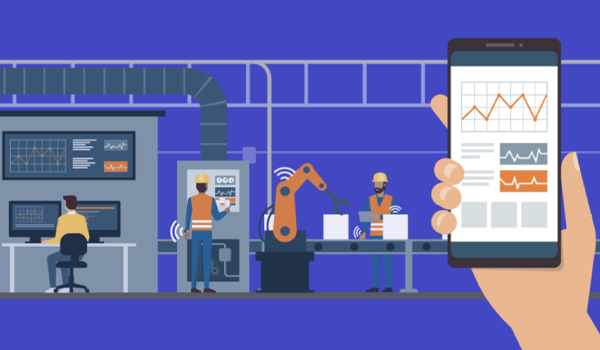 Illustration of a smart factory where SCADA and IoT bring many significant benefits to real-time production monitoring.