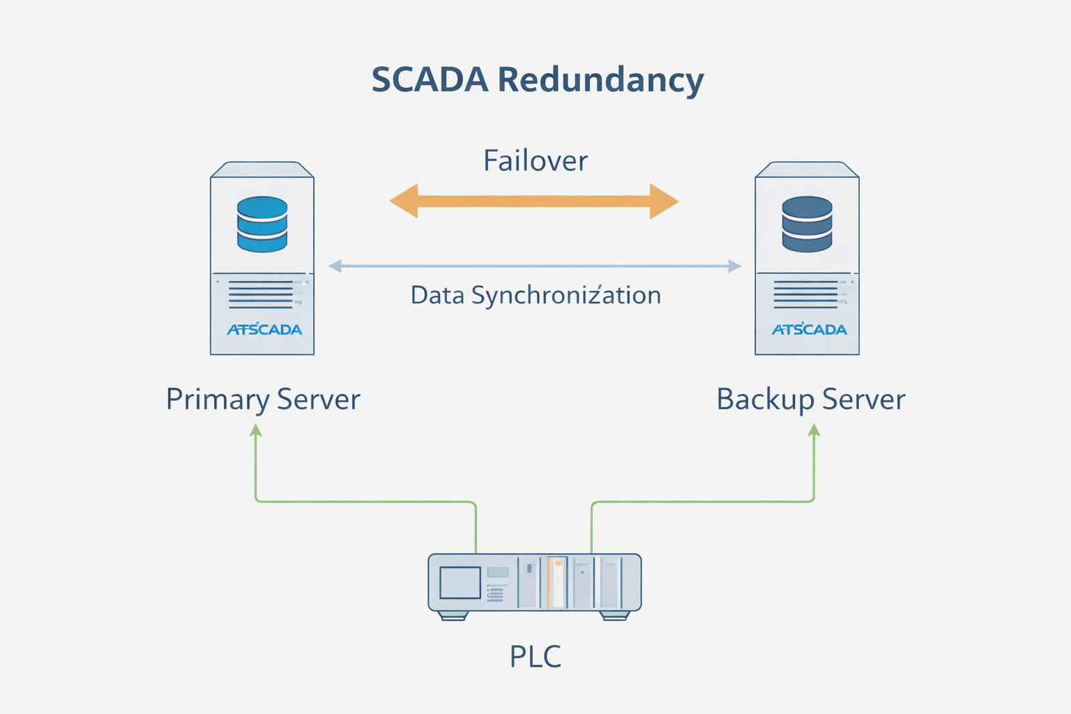Rather than relying on a single server or communication path, redundancy introduces backup components that operate alongside the primary system. With ATSCADA, this concept is implemented as a high-availability solution, ensuring that monitoring and control processes remain active under all conditions.