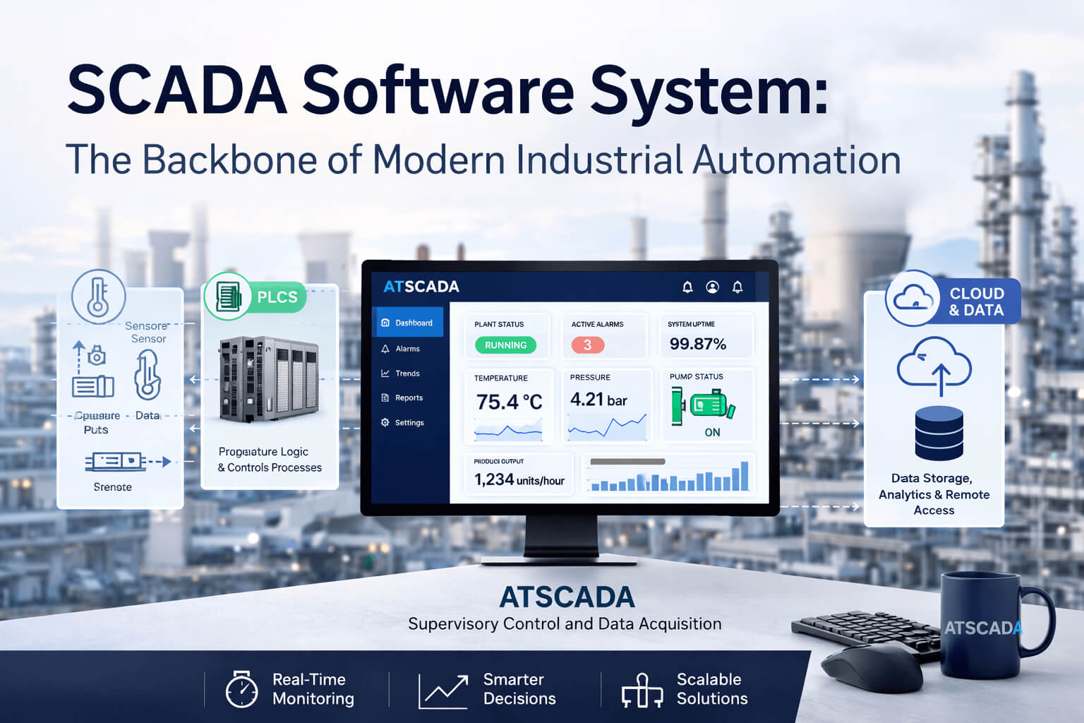 scada software system architecture with plc sensors cloud integration and real-time industrial monitoring dashboard